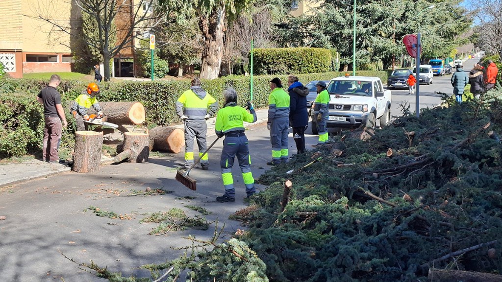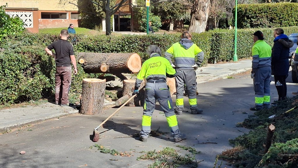 La brigada de los Servicios Municipales de retén de fin de semana se ha personado con celeridad y han hecho un extraordinario trabajo, seccionando ese enorme árbol con motosierras y despejando rápidamente esa arteria principal, para que se pudiera circular sin problema por una de las dos salidas de la urbanización Los Arroyos.