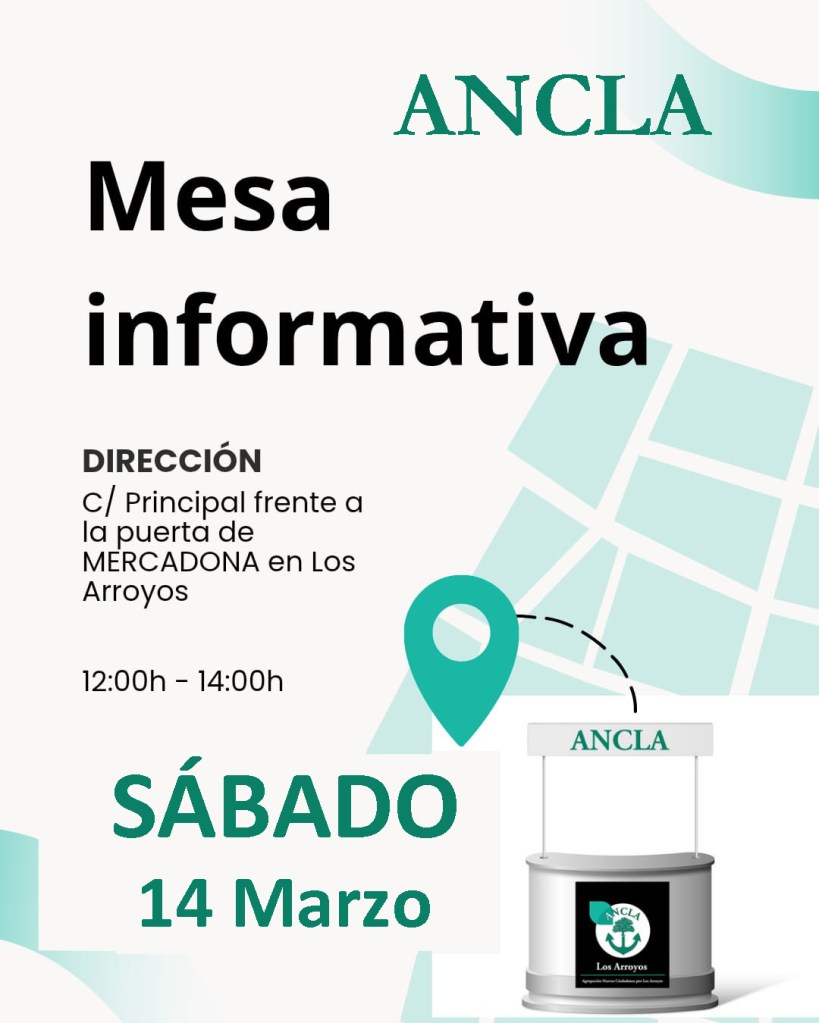 El próximo Sábado 14 de Marzo ANCLA instalará una nueva MESA INFORMATIVA en la C/ Principal frente a la puerta de MERCADONA en Los Arroyos, desde las 12.00 a 14.00 h. Nuestro objetivo con estas mesas es presentar el nuevo proyecto político a todos los vecinos y vecinas que se acerquen a conocernos.
