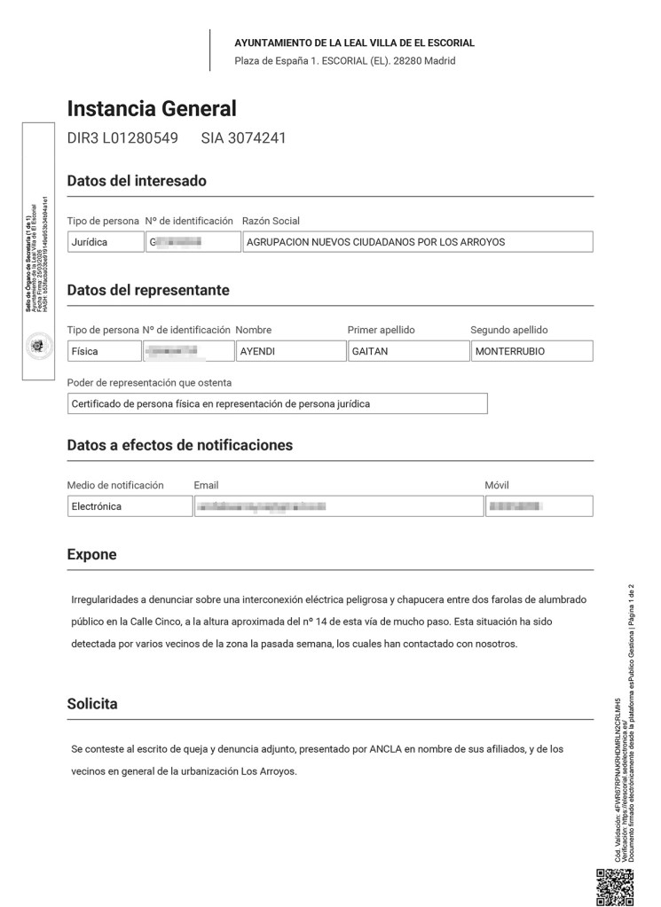 En ANCLA estamos dispuestos a que toda actuación irregular de este equipo de gobierno del PP sea denunciada como merece. Los ciudadanos tienen que tener respuesta de los políticos que rigen, de momento, el destino del Ayuntamiento de El Escorial, y también de aquellos que les sigan. Por este, motivo desde el primer minuto que vimos la chapucera actuación de la interconexión entre dos farolas en la Calle Cinco decidimos hacer un ESCRITO DE QUEJA que ya ha sido presentado en la Sede Electrónica del Registro Municipal.