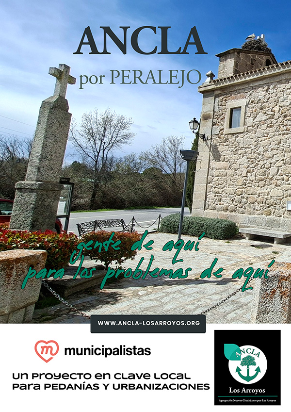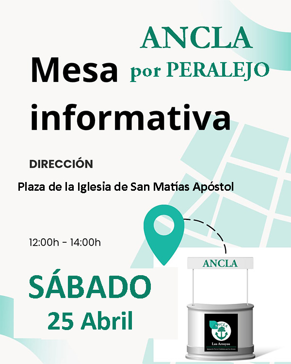 El próximo Sábado 25 de Abril ANCLA instalará una nueva MESA INFORMATIVA en PERALEJO, en la plazuela de la Iglesia de San Matías Apóstol, desde las 12.00 a 14.00 h. Nuestro objetivo con estas mesas es presentar el nuevo proyecto político a todos los vecinos y vecinas que se acerquen a conocernos.